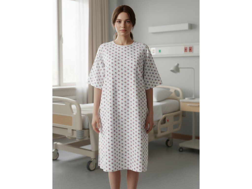 Tradičná košeľa pre pacientov s okrúhlym výstrihom. Dĺžka rukávov je 3/4 alebo krátke rukávy. Zaväzuje sa na chrbte.