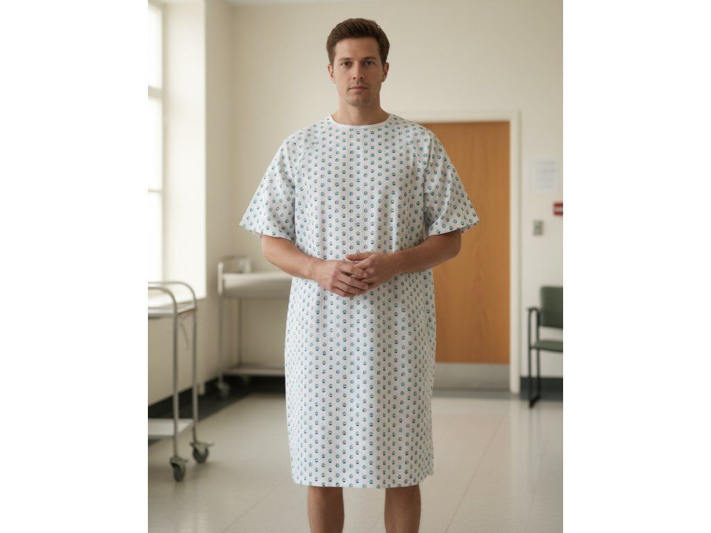 Tradičná košeľa pre pacientov s okrúhlym výstrihom. Dĺžka rukávov je 3/4 alebo krátke rukávy. Zaväzuje sa na chrbte.