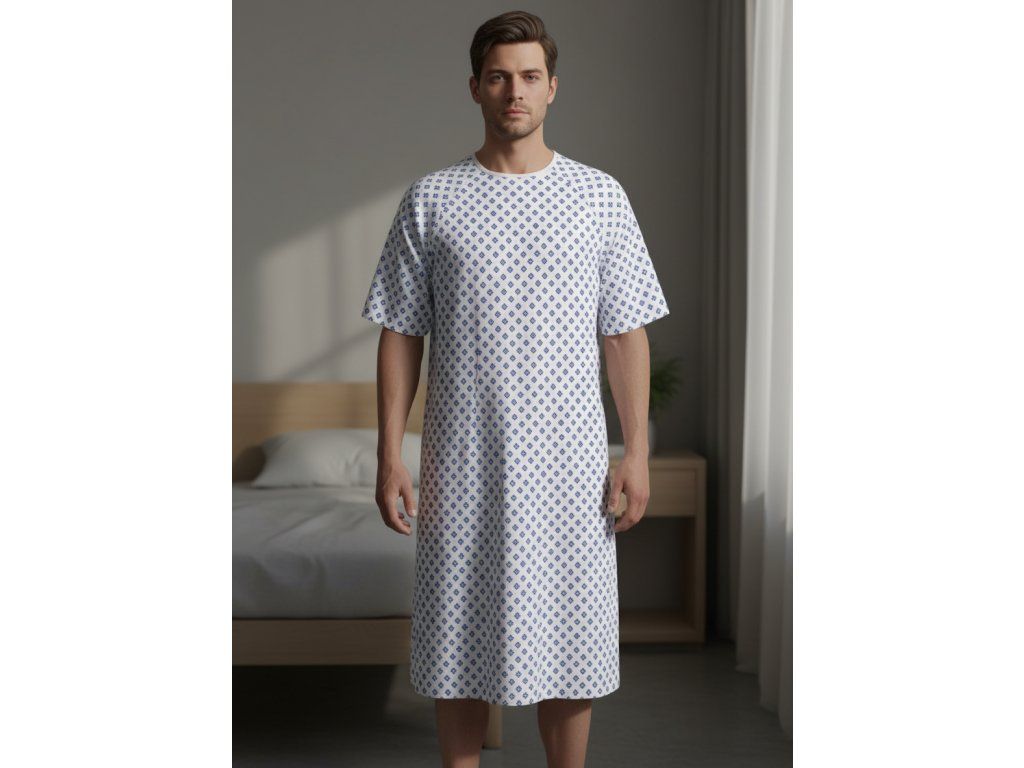 Tradičná košeľa pre pacientov s okrúhlym výstrihom. Dĺžka rukávov je 3/4 alebo krátke rukávy. Zaväzuje sa na chrbte.