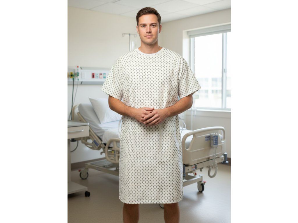 Tradičná košeľa pre pacientov s okrúhlym výstrihom. Dĺžka rukávov je 3/4 alebo krátke rukávy. Zaväzuje sa na chrbte.
